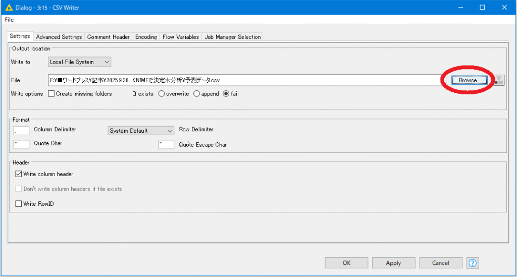 CSV Writerノードは、保存フォルダ・ファイル名の指定が必要です。ノードをダブルクリックして、設定画面を開きましょう。