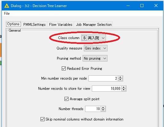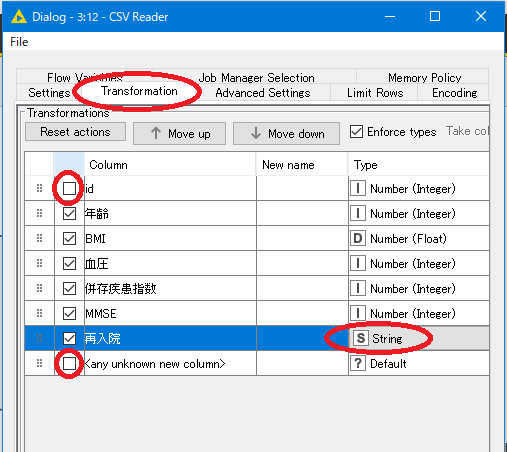 次に予測をしたい項目である「再入院」のTypeを確認します。TypeがNumberになっていたら、画像のようにStringにします。データがダミー変数(0か1)で入力されていると、データ型が数値として扱われていることがあります。今回は分類モデルを作成するため、TypeがNumber(Integer)だと後続のノードでエラーが出てしまいます。