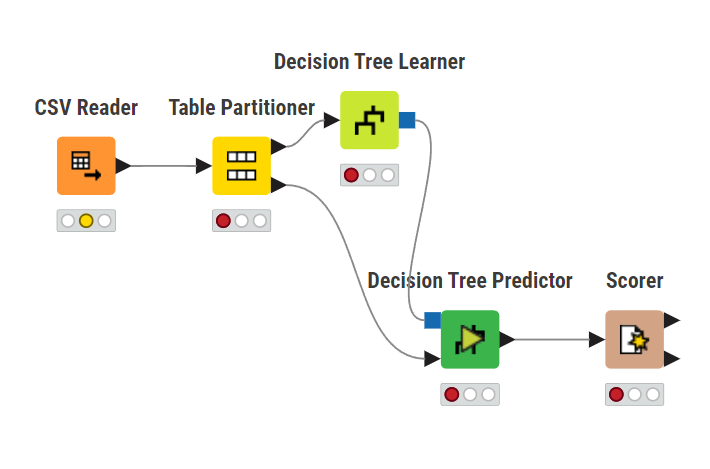 注意が必要なのは「Table Partitioner」の接続です。「Table Partitioner」ノードの右上から出る矢印を「Decision Tree Learner」へ、ノードの右下から出る矢印を「Decision Tree Predictor」へ接続します。逆につなぐと、モデルの精度が下がってしまいます。