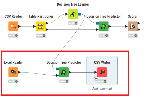 実際に新しいデータを読み込み、「Decision Tree Predictor」に接続すると、新規のデータに対しても予測ができます。