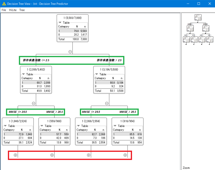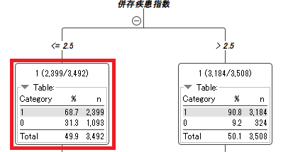 緑色の四角で囲まれた部分は、分岐の条件です。たとえば一番最初の分岐では、並存疾患指数が2.5より大きければ右下の枝に、そうでなければ左下の枝に分岐します。