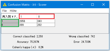 First Column が正解データ、Second Columnがモデルにより予測されたデータです。それぞれ「再入院」と「Prediction(再入院)」が正しく選択されています。