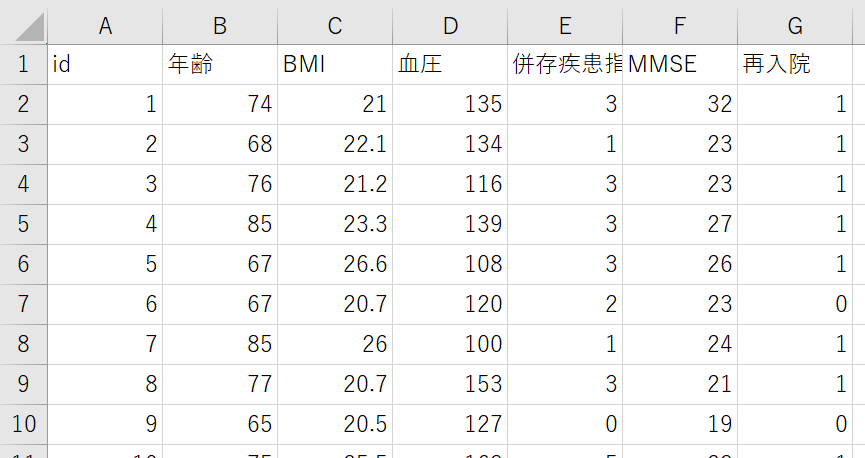 年齢・BMI・血圧・併存実感指数・MMSEから再入院するかどうかを判定するモデルを作成します。再入院ありなら1,再入院無しなら0が再入院列に記載されています。