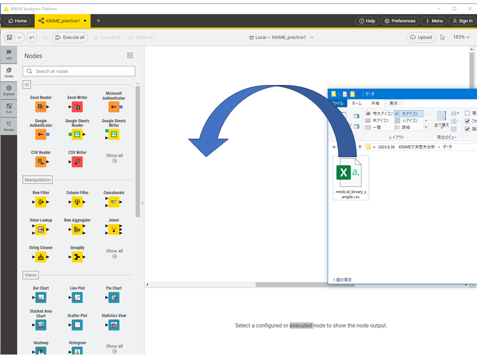 ワークフローの編集画面が表示されたら、分析したいファイルを任意のフォルダからドラッグアンドドロップでワークフローエリアに投入します。今回はCSVファイルですが、エクセルファイルでも構いません。KNIMEが自動的に判断して、適切なノードを配置してくれます。