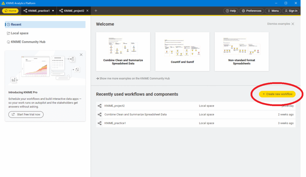 左上のHomeボタンを押してhome画面を表示させ、右側の「Create new workflow」ボタンを押します。