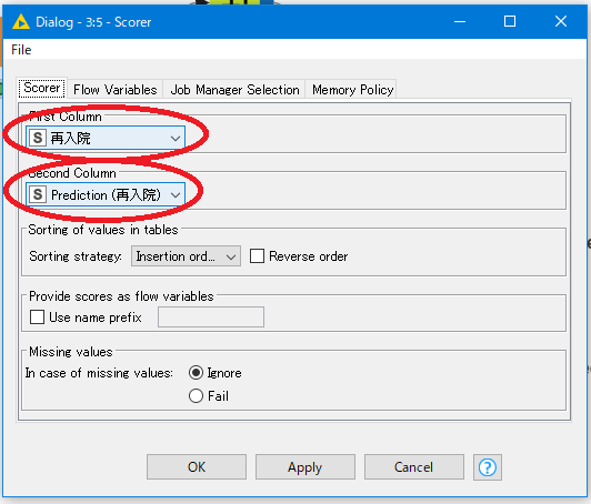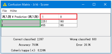 このノードでは、正解データ(実際の再入院結果) と 予測結果(モデルによる予測値) を比較し、モデルの精度を評価します。