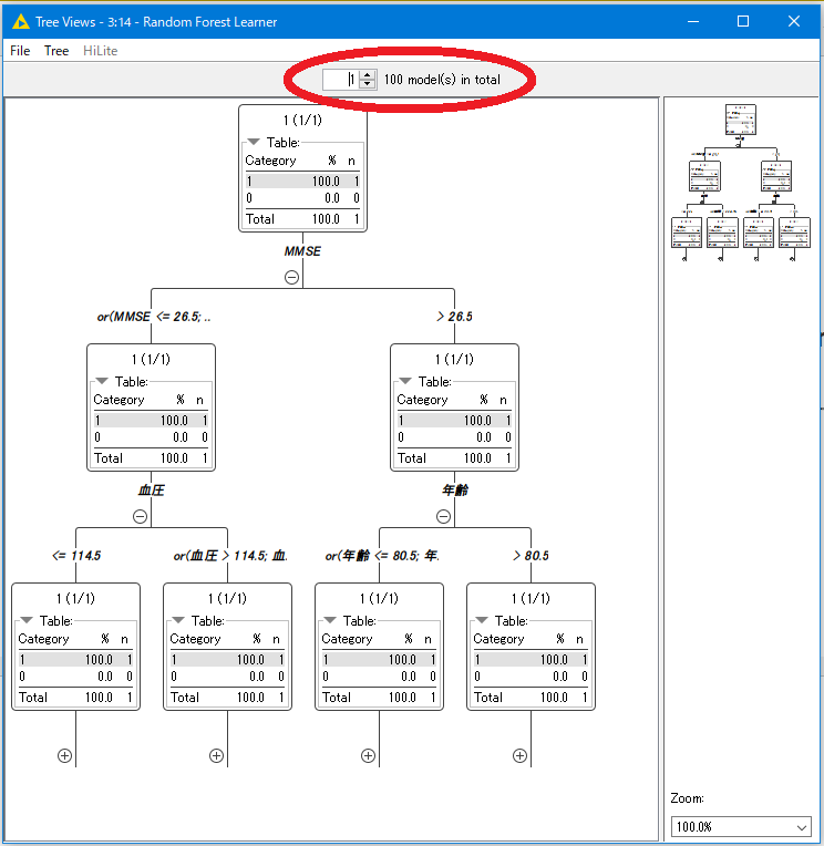 この様な図が表示されます。ランダムフォレストの学習器が生成した、100個のツリーを確認できます。赤丸の数値を変えると、順次ツリーがひょじされていきます。