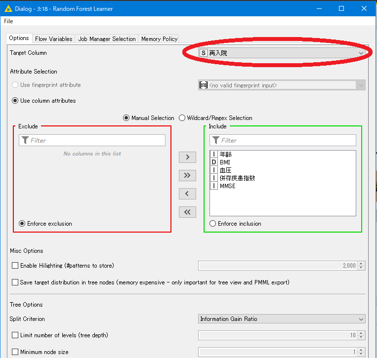Excel Readerノードをダブルクリックして、IDなどの不要なデータ列を除去しましょう。なお、新規データに予測に必要なデータ列が含まれていないとエラーになります。