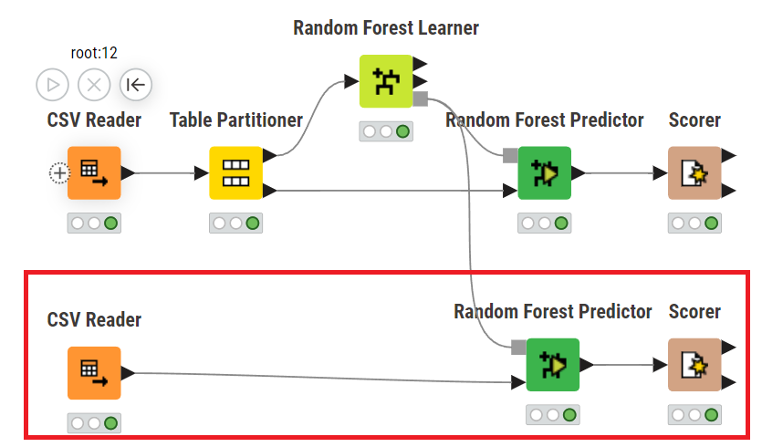ポイントは先ほど配置したRandom Forest Learnerを新しいRandom Forest Predictor に接続する事です。これをしないと予測が出来ません。