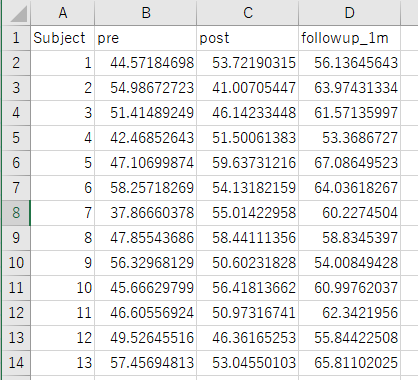 - 測定されたデータを、症例ごとに横並びに配置配置します。先頭列はIDやSubjectなどで、そのあとに計測データが続く形です。なお、IDなどの個体識別データ(この表で言えば『Subject』列)は無くても解析可能です。