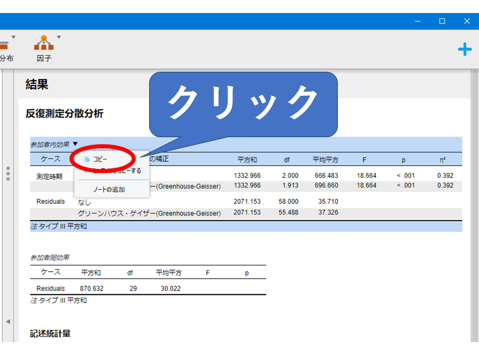 JASPの使用によりシンプルな操作で、統計をかける方法をご紹介しました。