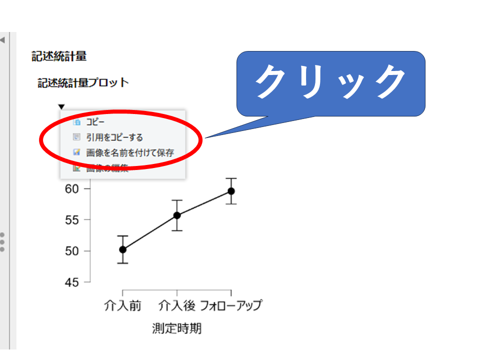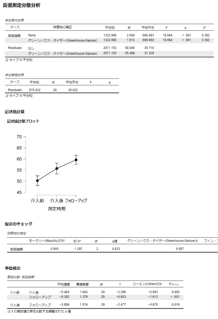 このように、たった50秒で反復測定一元配置分散分析、球面性の仮定のチェック、効果量、多重比較、グラフ作成までできました。