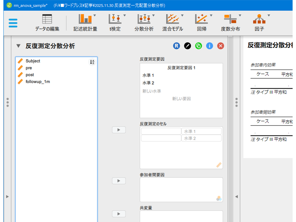 反復測定分散分析のメニューを開くと以下のような画面になります。