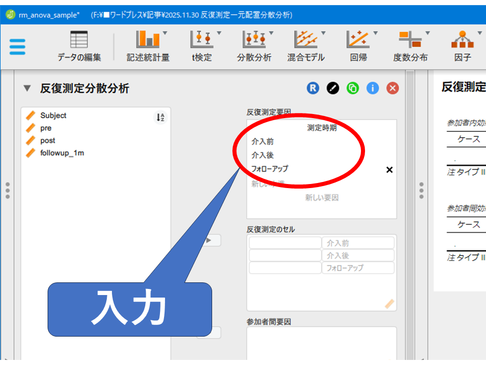 まずは、以下の赤丸内のデータ名を入力していきましょう。反復測定したデータ列に対応した名前を入力しておくとわかりやすいです。ここで入力した名前が、その下にある「反復測定のセル」枠に反映されます。