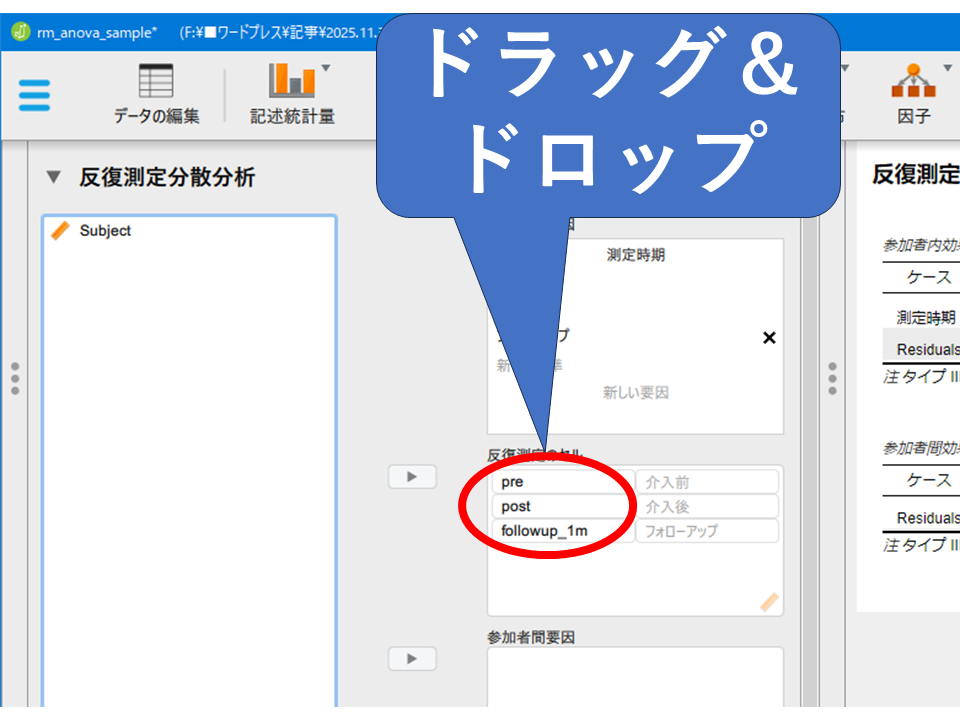 この設定で反復測定一元配置分散分析がすぐ実行されます。