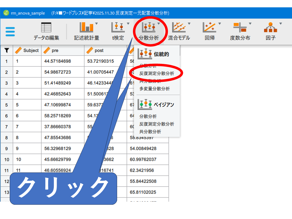 1,上のメニューから「分散分析」→「反復測定分散分析」を選択