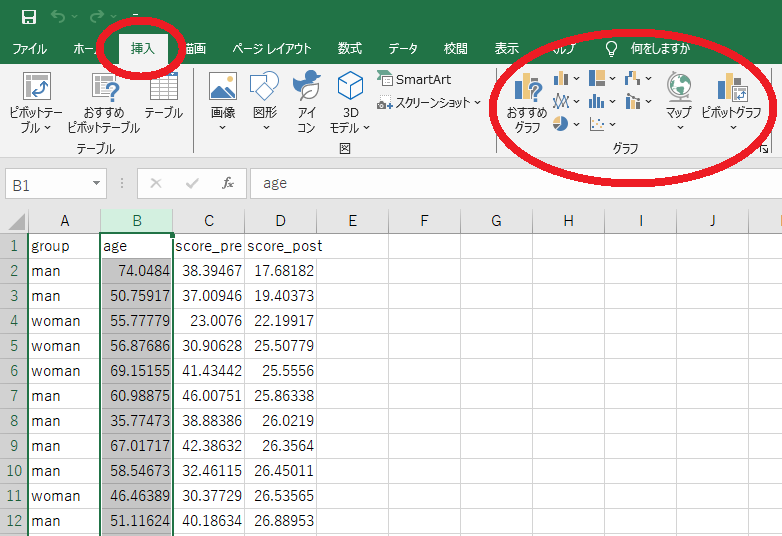 グラフを作成するときは、グラフを出力したい列を選んで、挿入タブのグラフメニューから必要なグラフ形式を選ぶことが出来ます。