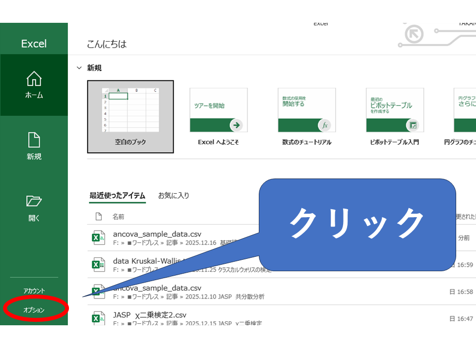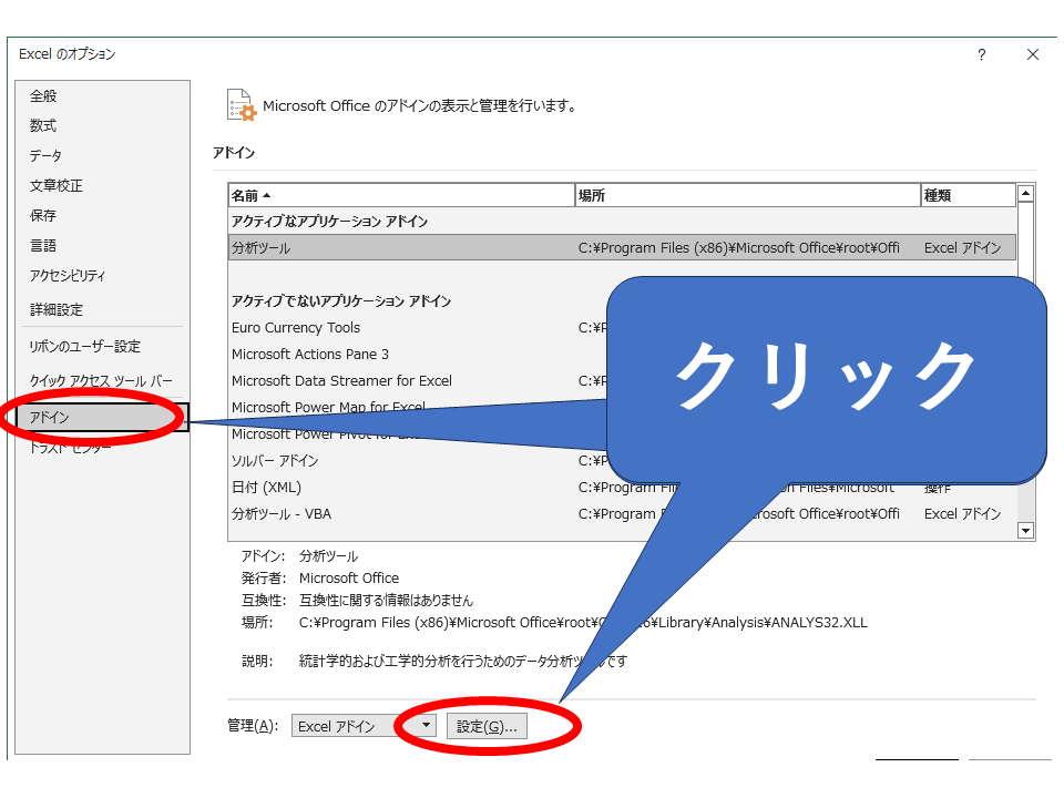次に統計量を計算可能にするため、メニューを追加します(アドインを有効にします)。