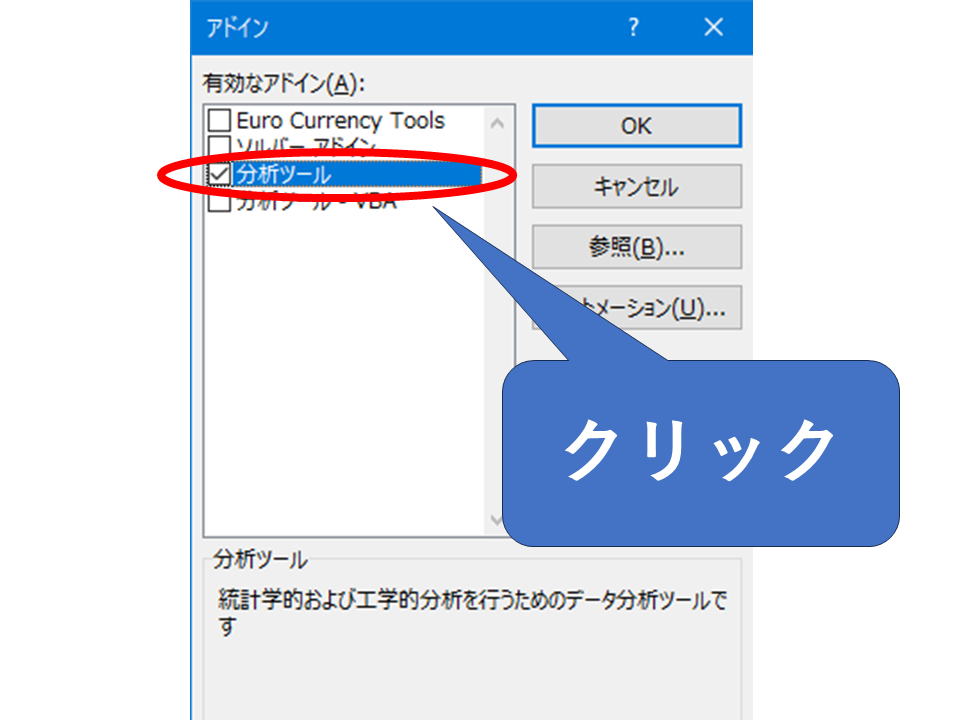 表示されたメニューから、「分析ツール」にチェックを入れてOKをクリックします。