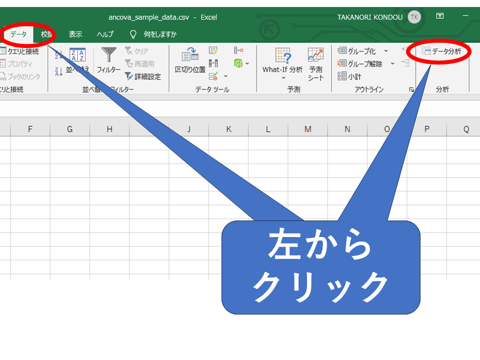 以下のように「データ」メニューから、「データ分析」をクリックします。