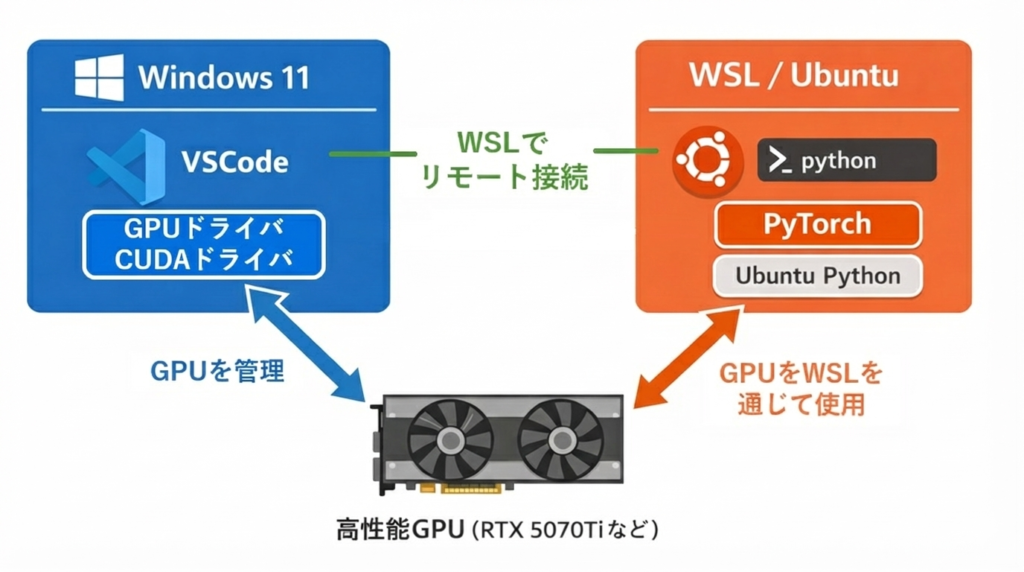 Windows 11 では NVIDIA ドライバが GPU を直接管理しており、WSL 上の Ubuntu はそれを経由して GPU を利用します。VS Code はあくまで作業用のエディタで、どの OS 側に接続しているかによって、見えている Python やライブラリが変わります。