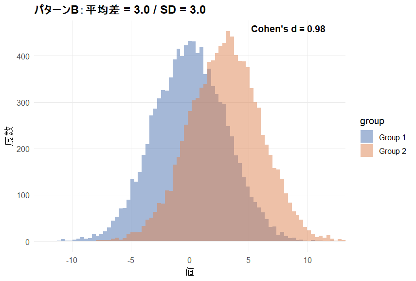 一方、下のグラフでは平均値の差は上と同様に3.0ですが、データのばらつき(SD = 3.0)も大きいため効果量はCohen`s d = 0.98と上のグラフより低く算出されています。