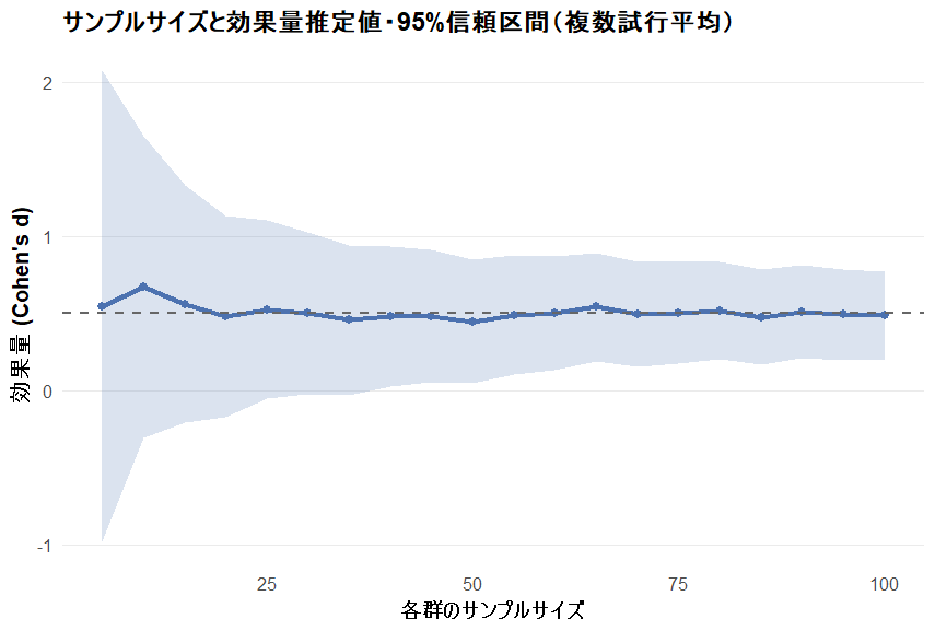 サンプルサイズが大きければ(グラフ右側)効果量の信頼区間も一定の範囲に収まりますが、サンプルサイズが25以下(グラフ左側)では精度が下がり、推定の幅が広がっているのが確認できます。