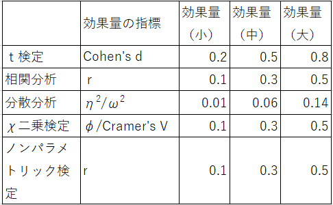 ※参考 「水本 篤:効果量と検定力分析入門 ―統計的検定を正しく使うために― 2011」より一部改変。リンク先はJstageの該当ページです。