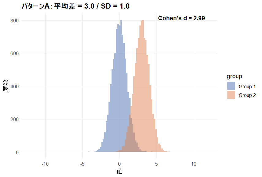 上のグラフではばらつきが小さい(SD = 1.0)ため、効果量がCohen`s d = 2.99と算出されています。