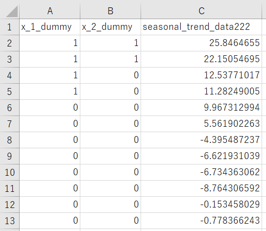 データのほうを見てみると以下のような具合です。外部変数である左・中央列が予測対象である、右側列と同じラインで終わっています。予測期間分の外部変数を下に追加することでエラーを解消できます。