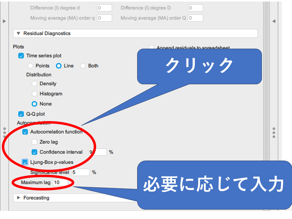自己回帰が残存していないかチェックするには「Autocorrelation」の「Autocorrelation function」と「Ljung-Box p-values」にチェックを入れます。それぞれ、残差の自己回帰を視覚的・統計検定で確認できます。