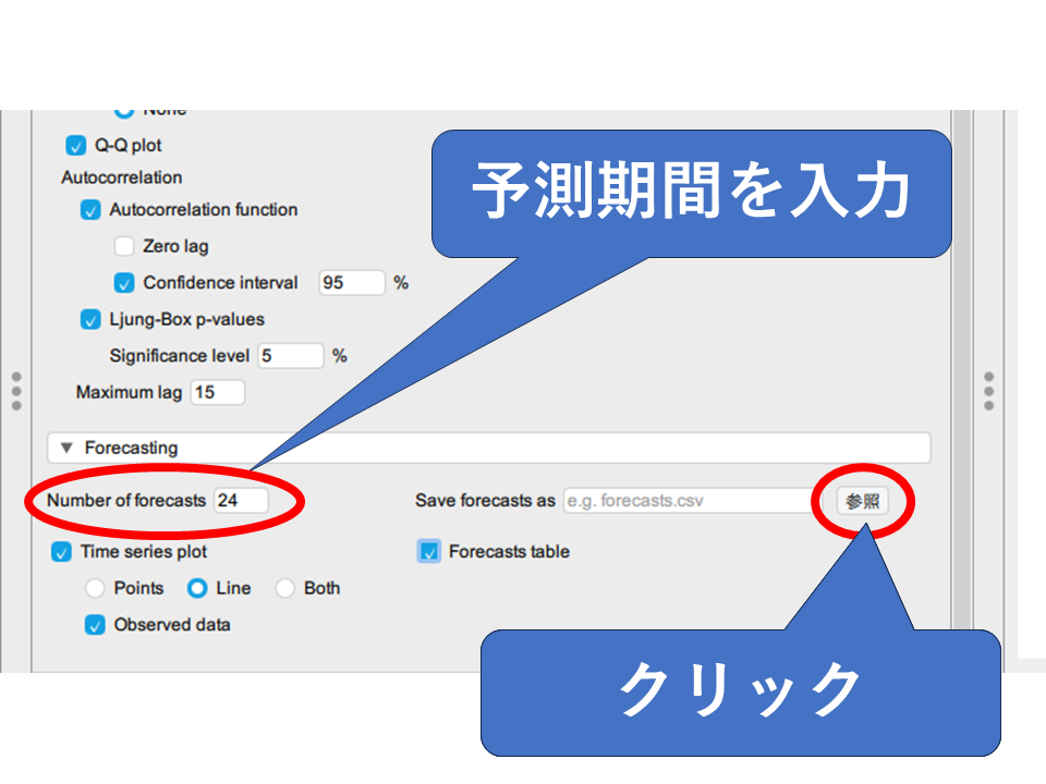 予測結果を視覚的に確認したい場合は「Time series plot」にチェックを入れましょう。数値で確認したい場合は「Forecasts table」にチェックを入れましょう。