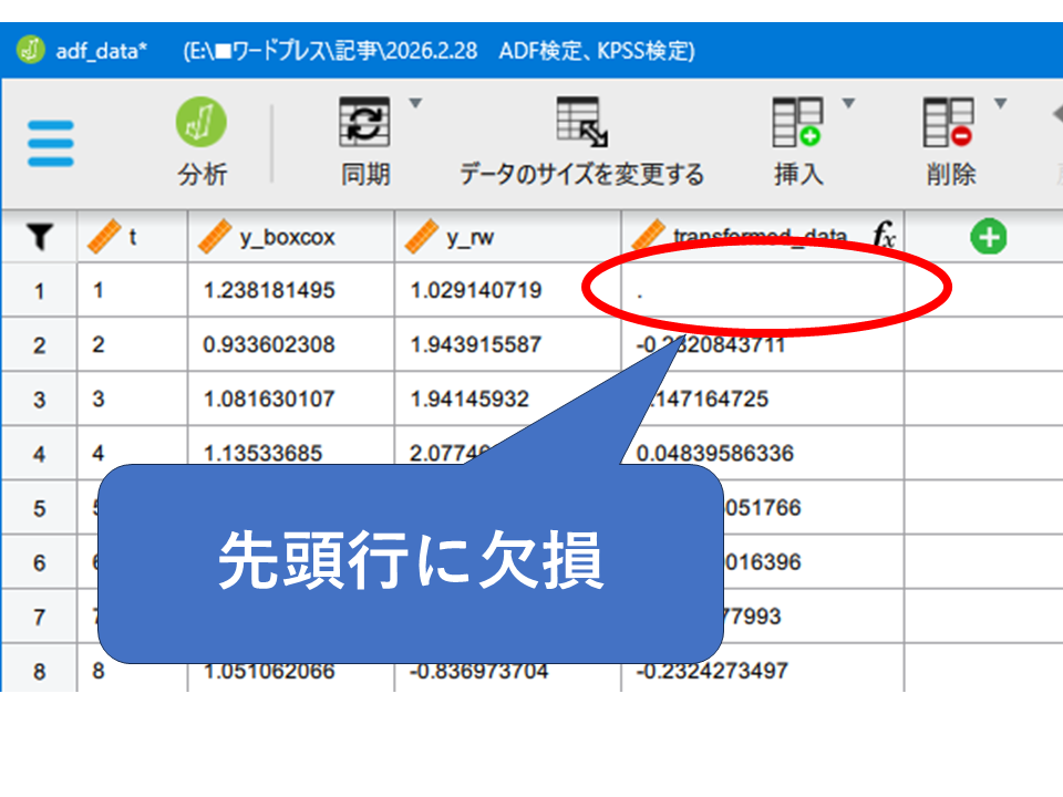 Excelなどの外部ソフトで前処理した場合や、JASPの「Time Series」の「Stationarity」メニューでデータを変換したときに出やすいです。