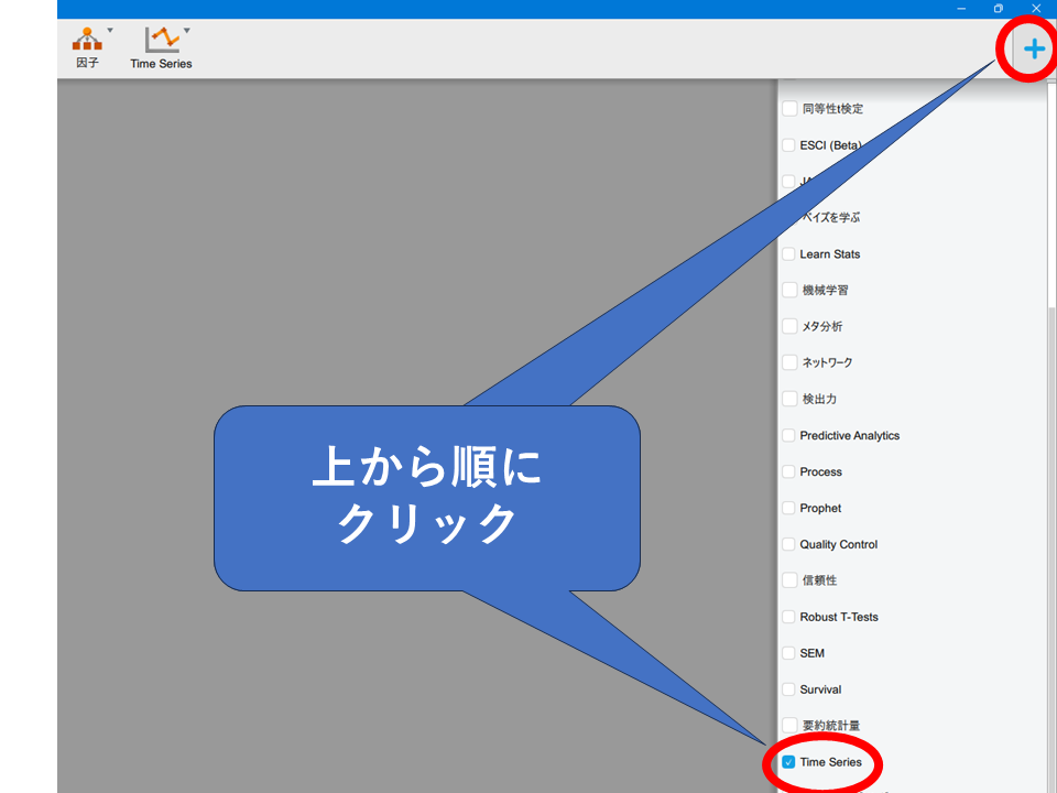 データの読み込みが終わったら、時系列分析のメニューを有効にします。JASPでは時系列分析用のメニューがデフォルトでオンになっていません。画像を参考に、時系列分析メニューを有効にしましょう。JASPが問題なく動作すれば、上部の分析メニューに「Time series」が追加されます。