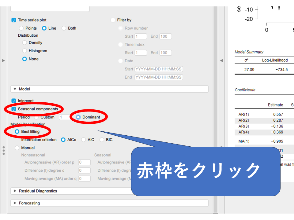 パラメータ設定は「Model」タブにあります。季節周期がある場合は「Seasonal components」にチェックを入れ、PeriodはDominantにします。自己回帰や差分などのパラメータ設定はModel Specificationで設定します。「Best fitting」にチェックを入れてモデル評価はAICcを選択しましょう。AICcはAICを小標本向けに調整した派生版です。