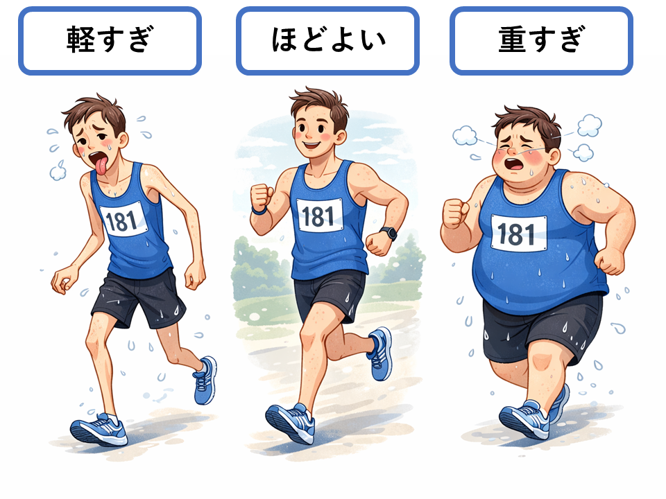 体重が減りすぎると体力が続きません。しかし、太りすぎても体が重くなり、思うように動けなくなります。つまり、運動パフォーマンスが最も高くなるのは「ほどよい体格」のときです。体重が少なすぎても、多すぎてもパフォーマンスは下がってしまいます。