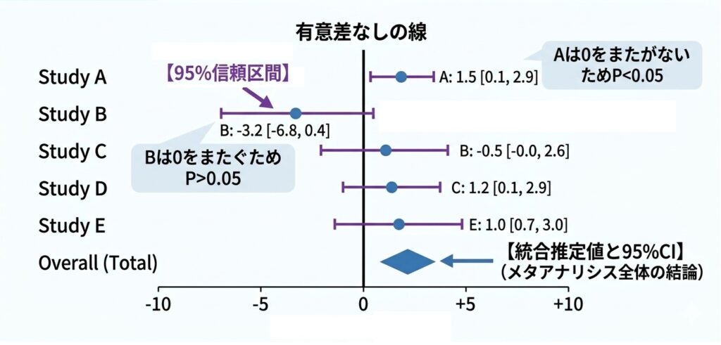 - 95%CI が 0 をまたぐ(例:-2.1〜3.4) → p > 0.05(有意差なし)