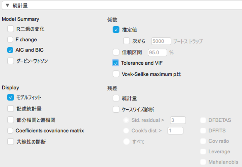 モデル比較に使用されるAICやBIC、多重共線性の指標であるVIFなどが必要であれば以下のようにします。