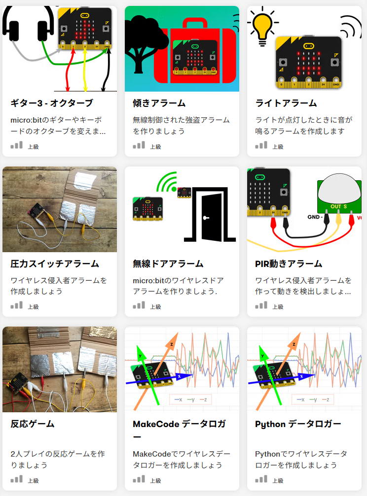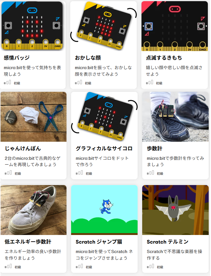公式サイトには初級〜上級まで100件以上のサンプルプログラムが用意されています。マイクロビットは「遊びながら学べる」作品例が豊富です。